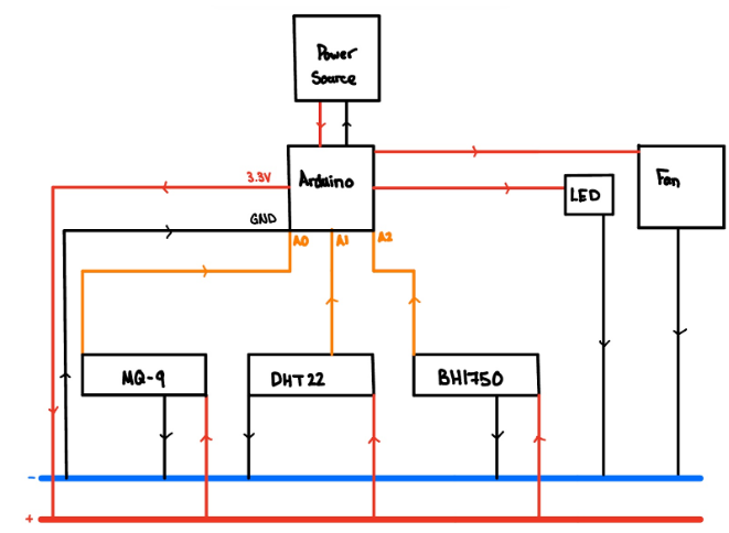 The Greenhouse System is an automated climate control setup my partner and I built to monitor and maintain temperature, humidity, light, and air quality in a controlled space. Using an Arduino Uno with DHT22, BH1750, and MQ-9 sensors, the system reacts in real time by powering a fan or LED when certain thresholds are reached. My partner and I designed the system and I coded the full setup to collect and process data efficiently.