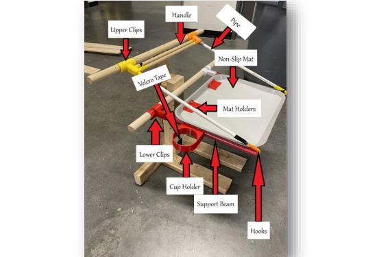 The final design features a foldable tray supported by PEX beams, 3D-printed hooks and clips, and a silicone non-slip mat. The tray attaches using a simple clip-and-hook mechanism, allowing it to lock in place for use or fold down for storage. The result is a simple (but effective) system that enhances user independence without adding complexity.